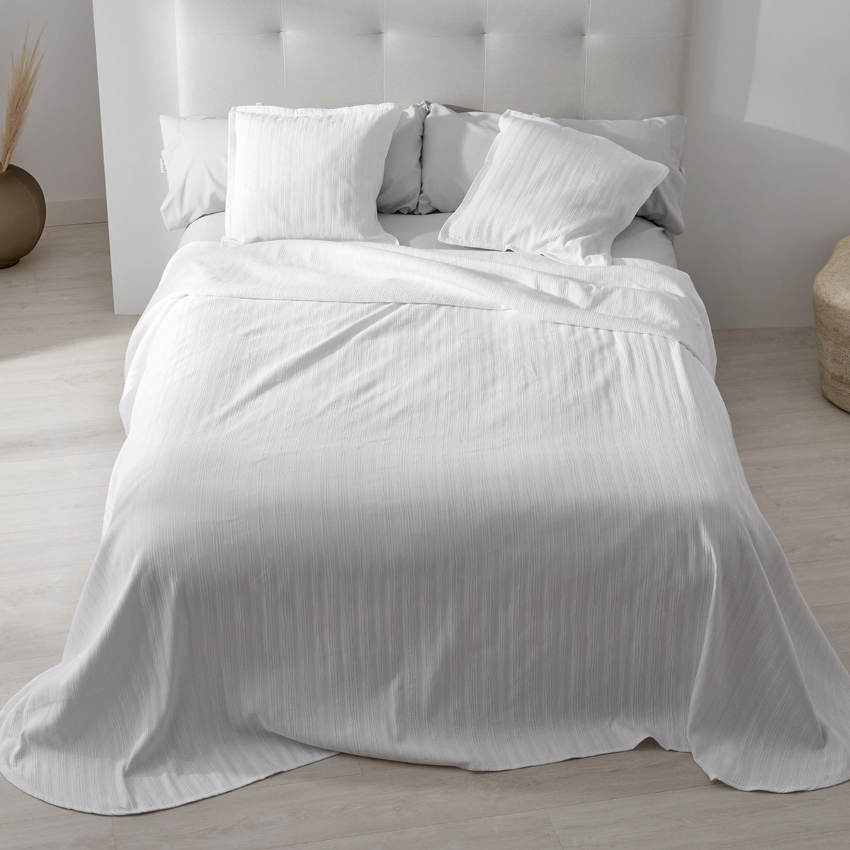 Disponible en azul, crudo y blanco, tres tonos neutros y atemporales que encajan en cualquier estilo de dormitorio. Ya sea que busques un look minimalista, rústico o moderno, la colcha Arona es la elección perfecta.