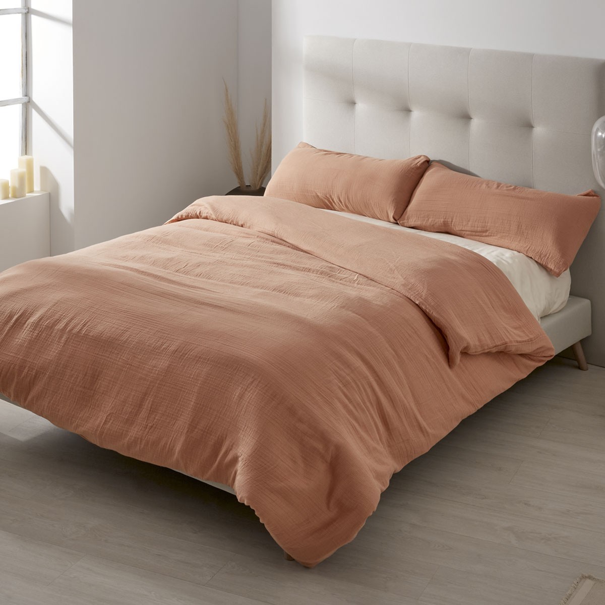 Duerme mejor, incluso en verano. El dúo Brisa (funda nórdica + funda de almohada) está pensado para quienes buscan ligereza, suavidad y estilo sin complicarse. Disponible en verde, coral y natural. Tejido tipo musselina (150 g/m²), mezcla de algodón y poliéster, con cierre de clips.
