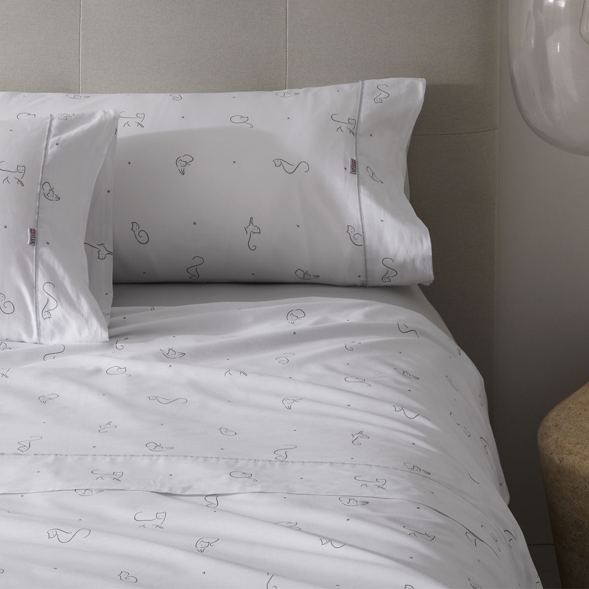 Si lo tuyo son los detalles con personalidad, el juego de sábanas Misi de Estelia te va a sacar una sonrisa cada vez que entres al dormitorio. Su estampado con siluetas de gatitos es una declaración de intenciones: aquí vive alguien que ama el descanso… y a los felinos.