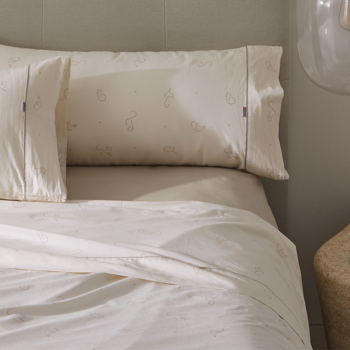 Si lo tuyo son los detalles con personalidad, el juego de sábanas Misi de Estelia te va a sacar una sonrisa cada vez que entres al dormitorio. Su estampado con siluetas de gatitos es una declaración de intenciones: aquí vive alguien que ama el descanso… y a los felinos.