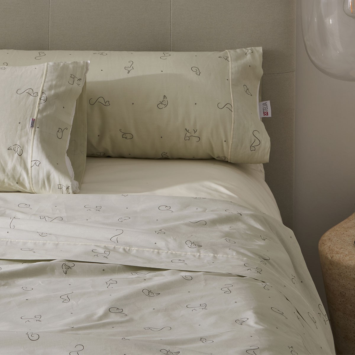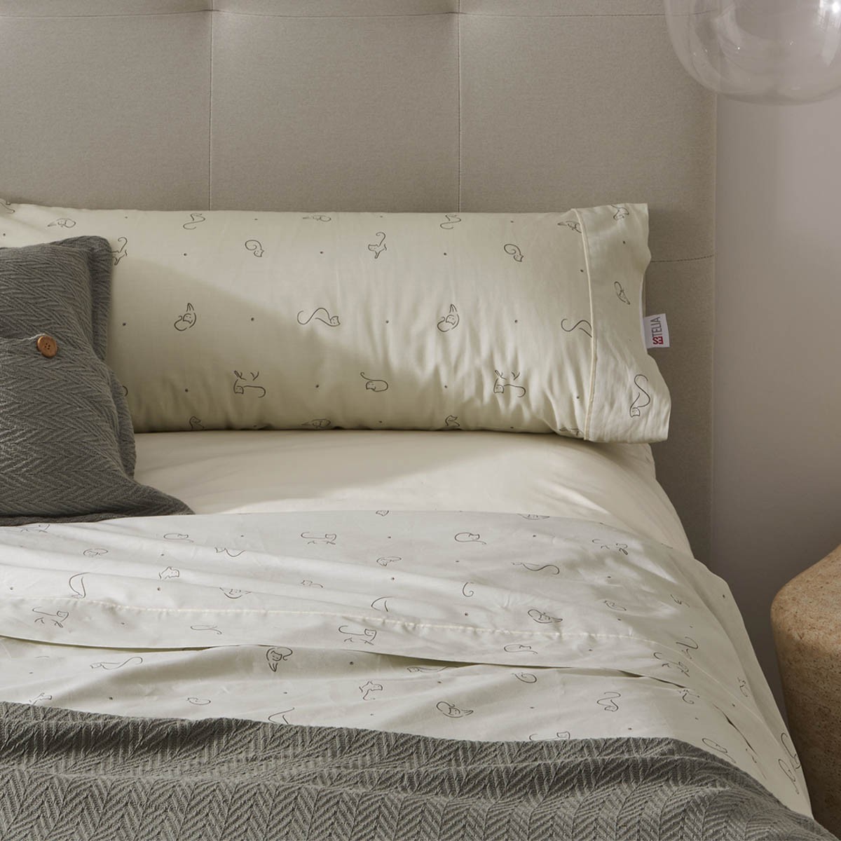Si lo tuyo son los detalles con personalidad, el juego de sábanas Misi de Estelia te va a sacar una sonrisa cada vez que entres al dormitorio. Su estampado con siluetas de gatitos es una declaración de intenciones: aquí vive alguien que ama el descanso… y a los felinos.
