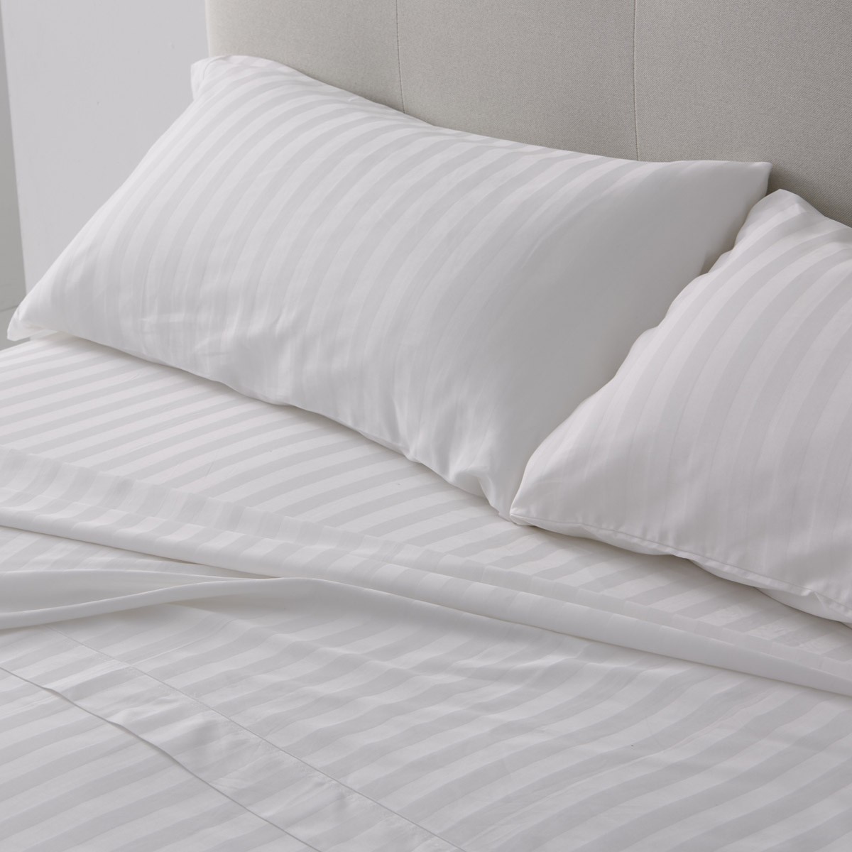 El satén listado blanco aporta un brillo discreto y un acabado premium que viste la cama como en un hotel. Combinan a la perfección con las sábanas, bajeras y funda nórdica de la misma colección si quieres un conjunto completo de alto nivel.