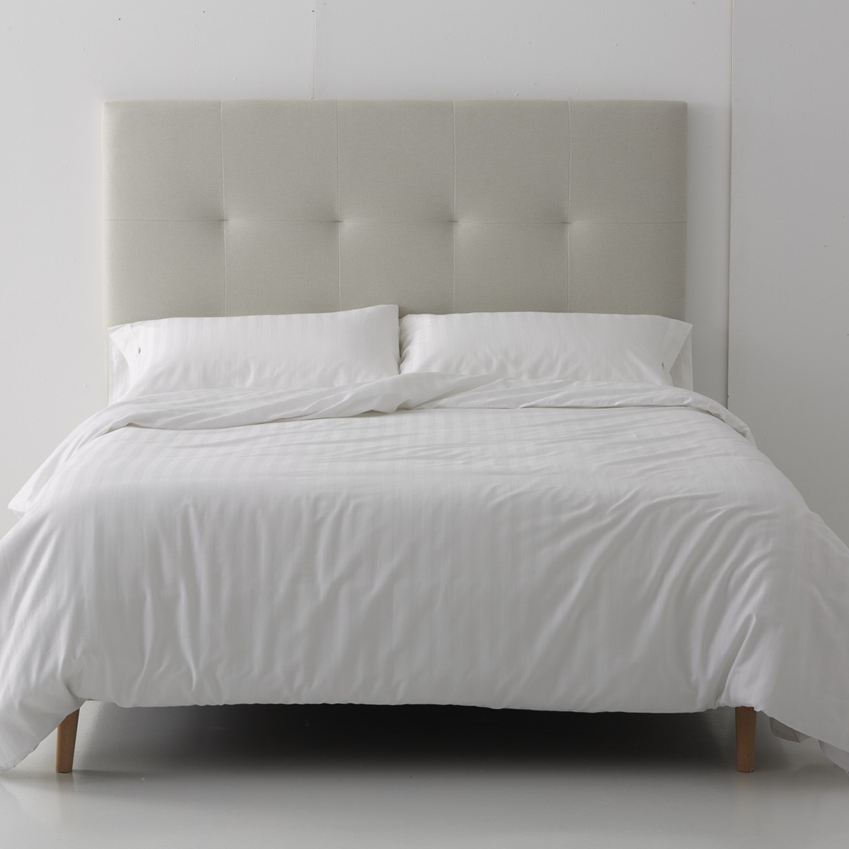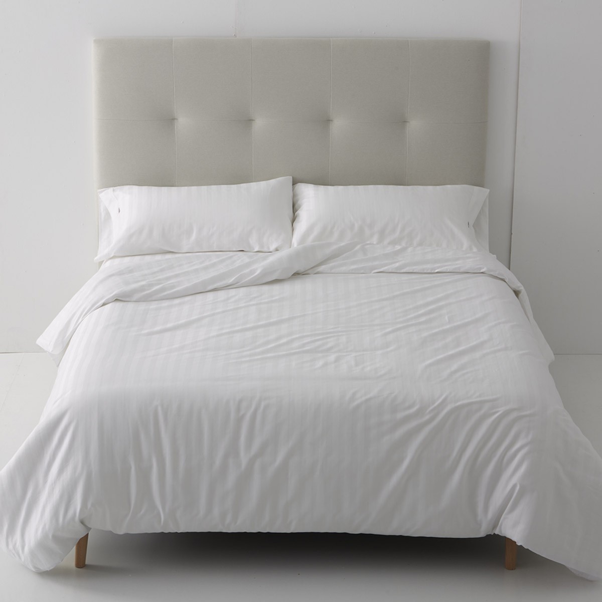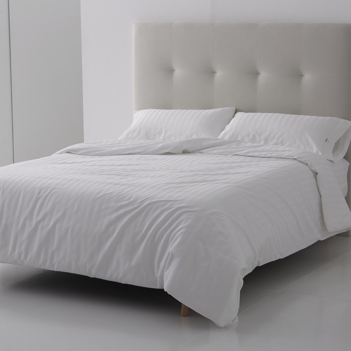 Funda nórdica de satén listado blanco Estelia: 300 hilos de puro algodón, tacto hiper suave y acabado de lujo. Hipoalergénica, sanforizada y disponible en medidas para camas modernas. Diseño elegante, calidad extra.